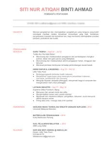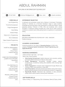 Untuk yang sedang cari internship, resume mesti fokus pada pencapaian akademik, latihan praktikal, dan apa-apa aktiviti ko-kurikulum. Boleh juga masukkan projek khas yang pernah buat. Resume jenis ini lebih kepada kronologi terbalik – yang terkini di atas.